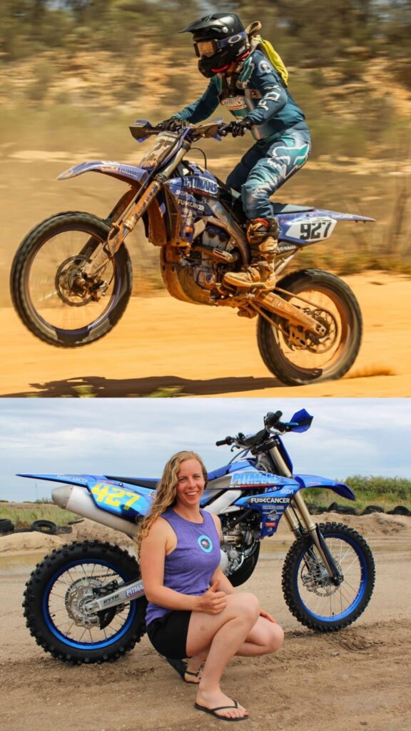 Is an Australian desert racer, dirtbike coach, and school teacher passionate about helping women and girls access motorcycling in a supportive and achievable way. She offers beginner and intermediate coaching for juniors and women, with a strong focus on learning to ride safely, building confidence, and progressing at each rider’s own pace. Naomi also provides a hire bike (TTR125) to reduce barriers for those wanting to try riding or attend coaching without owning a bike. Through Instagram and YouTube, she actively promotes women in motorsport, sharing educational content, racing insights, and practical riding tips. Her desert racing videos and bike set-up guides aim to make events like the Finke Desert Race feel more accessible and less intimidating for new and aspiring riders. At the heart of everything she does is community, connection, and empowering women to give it a go.